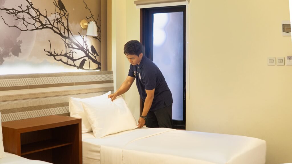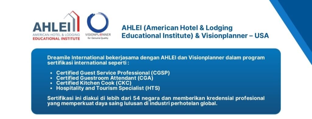 Kerennya Dreamile International, mereka punya fasilitas pendukung praktikum yang lengkap, persis seperti simulasi hotel sungguhan. Ada resepsionis, restoran, hingga housekeeping. Jadi, sebelum terjun ke dunia kerja, kita sudah terbiasa dengan situasi sebenarnya.