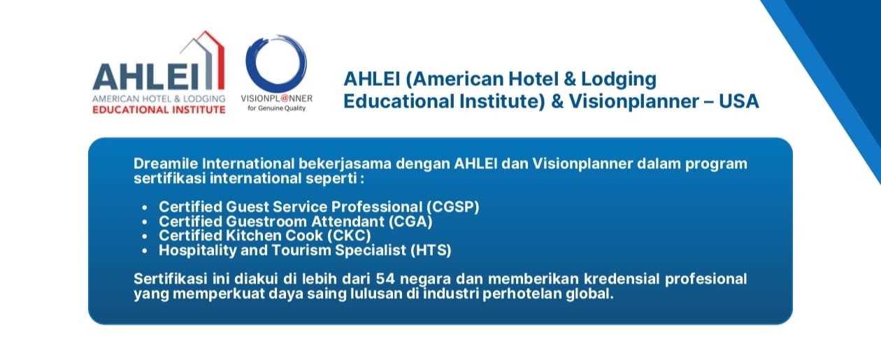 Dreamile International mentransformasi saya dari seorang pemimpi menjadi pelaku di industri perhotelan. Program praktikum intensif mereka benar-benar mendekatkan saya dengan realita dunia kerja. Para dosennya pun luar biasa, mereka tak hanya memberi teori, tapi juga pengalaman berharga mereka di hotel berbintang.